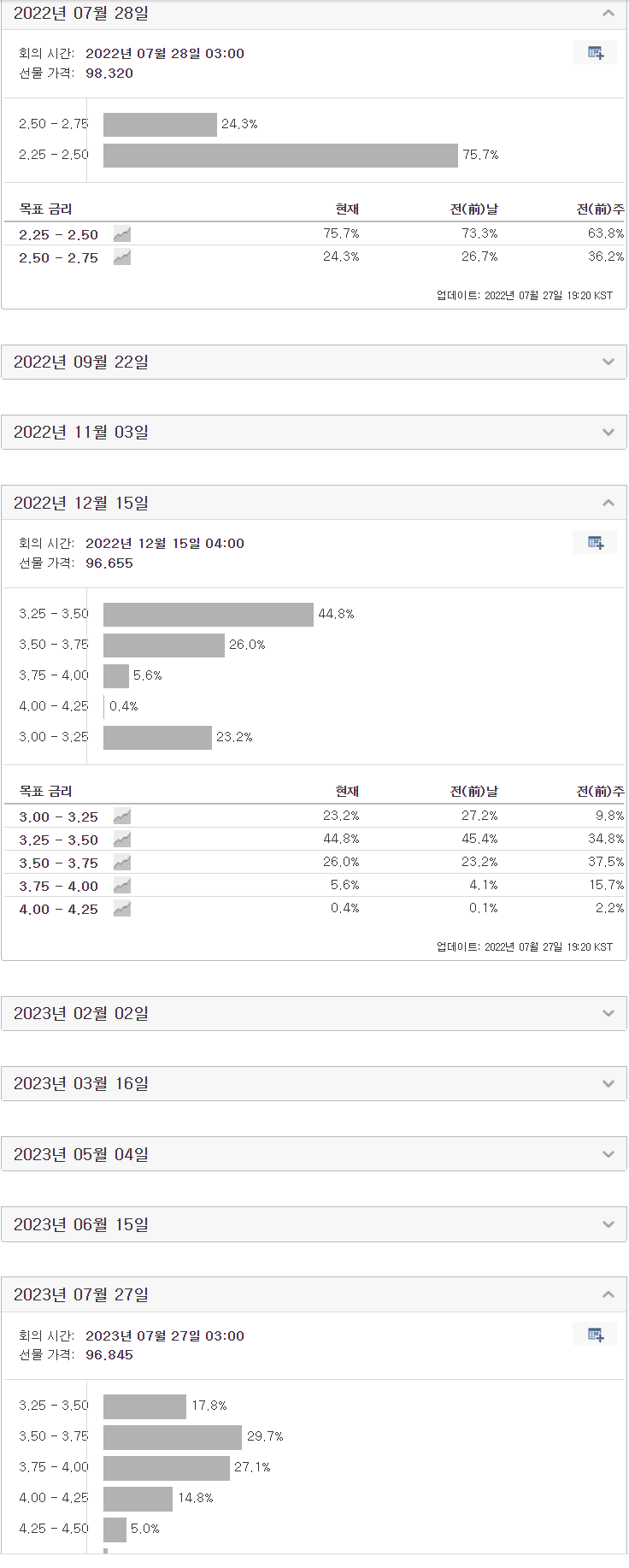 최근 고용에 대한 안 좋은 뉴스들이 전해지고 경기가 둔화되며 금리 예상치는 크게 내려갔다. 오늘 FOMC에선 금리를 0.75%인상하여 2.5%로 결정될 것으로 예상되지만 올해 말까지는 3.5%, 내년말까지는 3.75~4.00%정도까지 인상한다고 시장이 기대하고 있다.